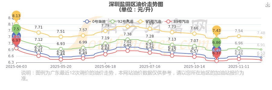 12月4日深圳盐田区汽油柴最新油价是多少?具体每升为:11月25日调整后,92号汽油为6.91元,降了0.05元,降幅达0.72%;95号汽油为7.48元,降了0.06元,降幅达0.8%;89号汽油为6.41元,降了0.05元,降幅达0.77%;0号柴油为6.53元,降了0.06元,降幅达0.91%。