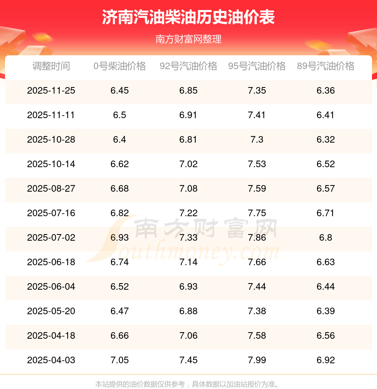济南汽油、柴油12月4日的价格是多少钱一升?详情为:92号汽油为6.85元,跌了0.06元;95号汽油为7.35元,跌了0.06元;89号汽油为6.36元,跌了0.05元;0号柴油为6.45元,跌了0.05元,本次油价的调整时间为11月25日。