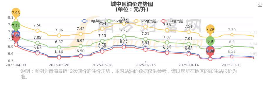 城中区汽油、柴油12月4日价格多少钱一升?具体为:0号柴油为6.46元,下调了0.05元;95号汽油为7.33元;92号汽油为6.84元;89号汽油为6.42元,调整时间为11月25日。