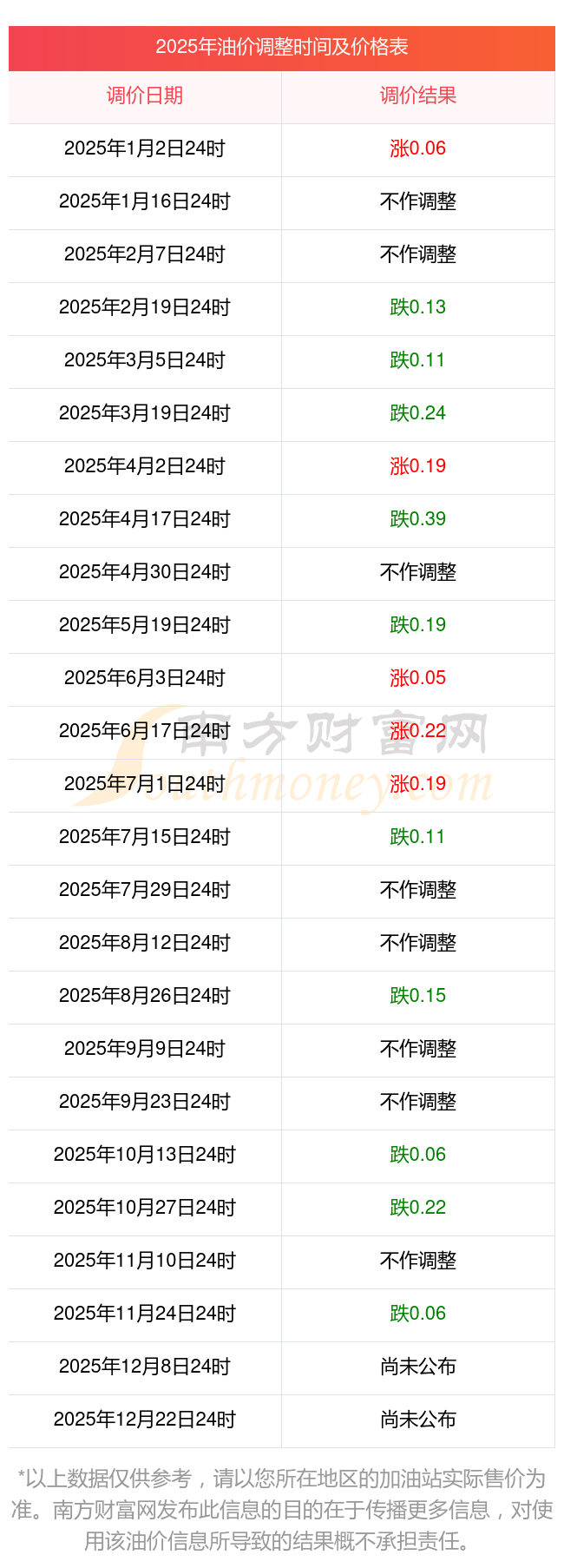 油价调整最新消息:下一轮油价调整时间12月8日24时。12月4日,贵州汽油、柴油每升最新价格为:调整时间为11月25日,92号汽油为7.01元,减了0.06元,减幅达0.85%;95号汽油为7.41元,减了0.06元,减幅达0.8%;89号汽油为6.62元,减了0.05元,减幅达0.75%;0号柴油为6.63元,减了0.06元,减幅达0.9%。