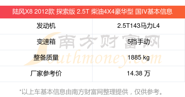陆风X8 2012款 探索版 2.5T 柴油4X4豪华型 国IV动力方面,搭载的是一台2.5T143马力L4涡轮增压发动机,匹配5挡手动挡变速箱,燃料形式为柴油,常规整备质量1885kg,厂家参考价14.38万元。