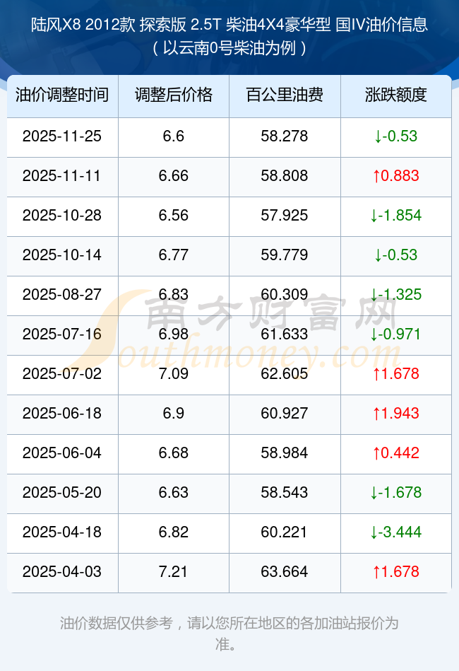 根据11月25日0号柴油最新调整价格6.6元/升来计算(以云南为例),该车型每百公里的平均油费是58.278元,上一轮11月11日调整价格6.66元每升来计算,每百公里的平均油费是58.808元,对比上一轮少花0.53元,下一轮的油价调整时间是12月8日24时。