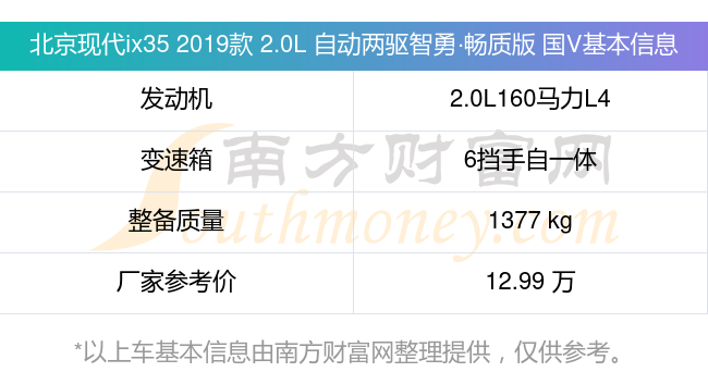 北京现代ix35 2019款 2.0L 自动两驱智勇·畅质版 国V动力方面,搭载的是一台2.0L160马力L4自然吸气发动机,匹配6挡手自一体自动档变速箱,燃料形式为汽油,常规整备质量1377kg,厂家参考价12.99万元。