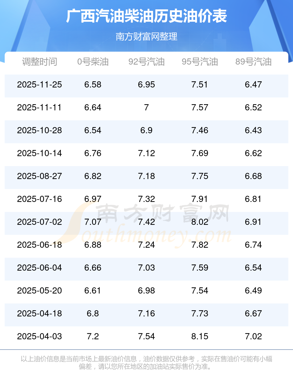 按11月25日92号汽油最新调整价格6.95元每升来计算(以广西为例),该车型百公里平均油费为60.813元,按上一轮11月11日调整价格7元每升来计算,百公里平均油费为61.25元,对比上一轮少花0.438元,下一轮油价调整时间为12月8日24时。