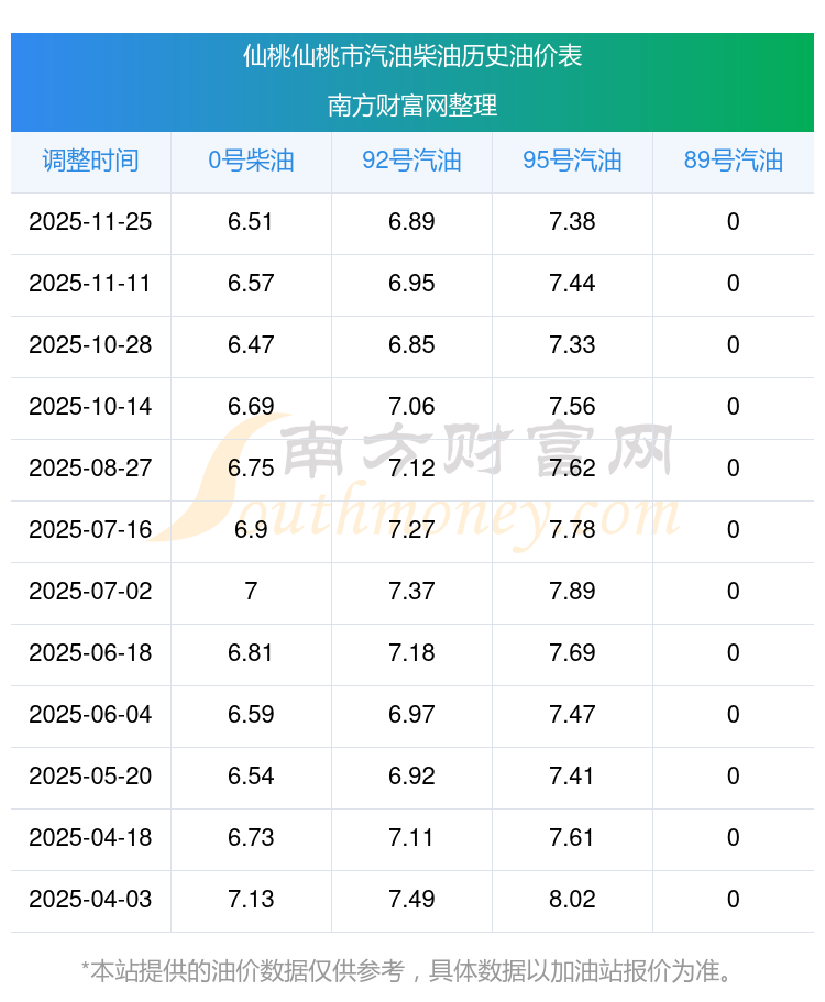 以上数据仅供参考,请以您所在地区的加油站实际售价为准。南方财富网发布此信息的目的在于传播更多信息,对使用该油价信息所导致的结果概不承担责任。