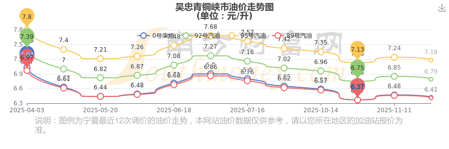 吴忠青铜峡市汽油、柴油12月4日每升最新价格为:92号汽油为6.79元;95号汽油为7.18元;89号汽油为6.41元;0号柴油为6.42元,调整时间为11月25日。