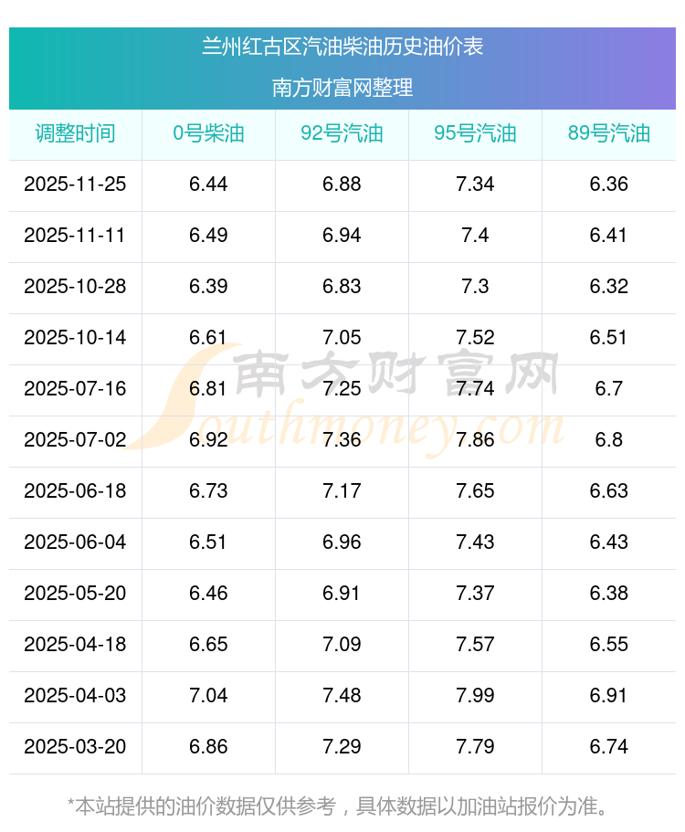 12月4日,兰州红古区汽油、柴油每升的价格是多少?本次油价调整时间是11月25日,92号汽油为6.88元,降了0.06元,降幅达0.87%;95号汽油为7.34元,降了0.06元,降幅达0.81%;89号汽油为6.36元,降了0.05元,降幅达0.78%;0号柴油为6.44元,降了0.05元,降幅达0.77%。