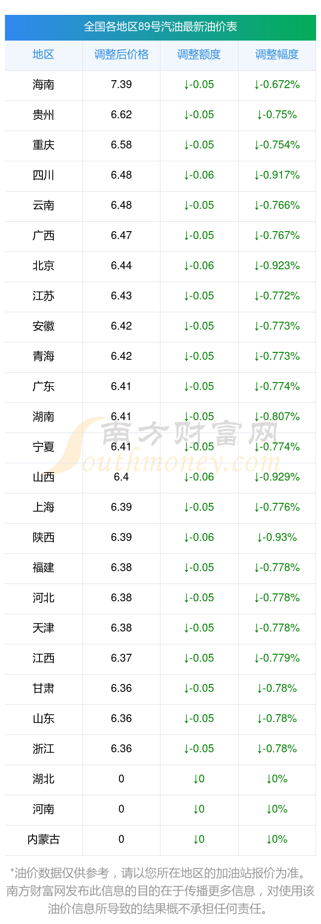 以上数据仅供参考,请以您所在地区的加油站实际售价为准。南方财富网发布此信息的目的在于传播更多信息,对使用该油价信息所导致的结果概不承担责任。