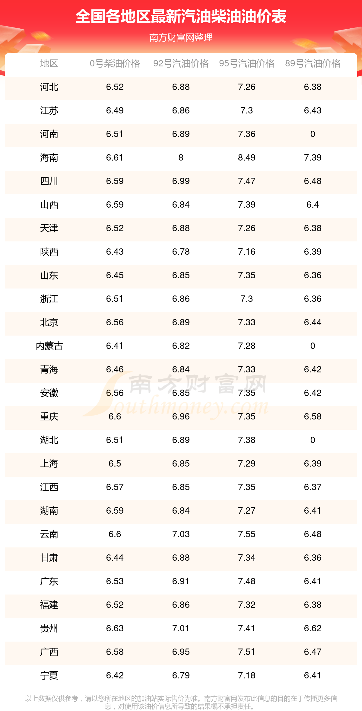 以上油价信息是当前市场上最新油价信息,油价数据仅供参考,实际在售油价可能有小幅偏差,请以您所在地区的加油站实际售价为准。
