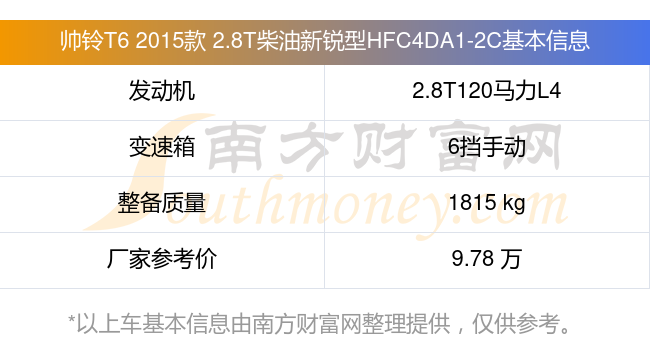 帅铃T6 2015款 2.8T柴油新锐型HFC4DA1-2C动力上搭载的是一台2.8T120马力L4涡轮增压发动机,匹配6挡手动挡变速箱,燃料形式为柴油,常规整备质量1815kg,厂家参考价9.78万元。