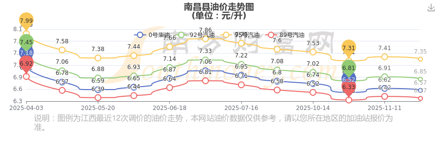 12月4日南昌县汽油柴最新油价是多少?具体每升为:11月25日调整后,92号汽油为6.85元,下跌了0.06元,下跌幅达0.87%;95号汽油为7.35元,下跌了0.06元,下跌幅达0.81%;89号汽油为6.37元,下跌了0.05元,下跌幅达0.78%;0号柴油为6.57元,下跌了0.05元,下跌幅达0.76%。