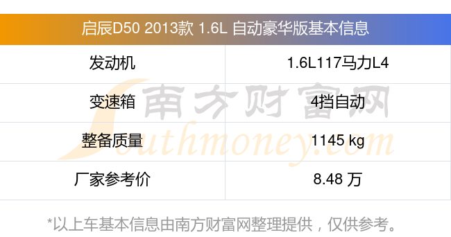 启辰D50 2013款 1.6L 自动豪华版动力上搭载的是一台1.6L117马力L4自然吸气发动机,匹配4挡自动档变速箱,燃料形式为汽油,常规整备质量1145kg,厂家参考价8.48万元。