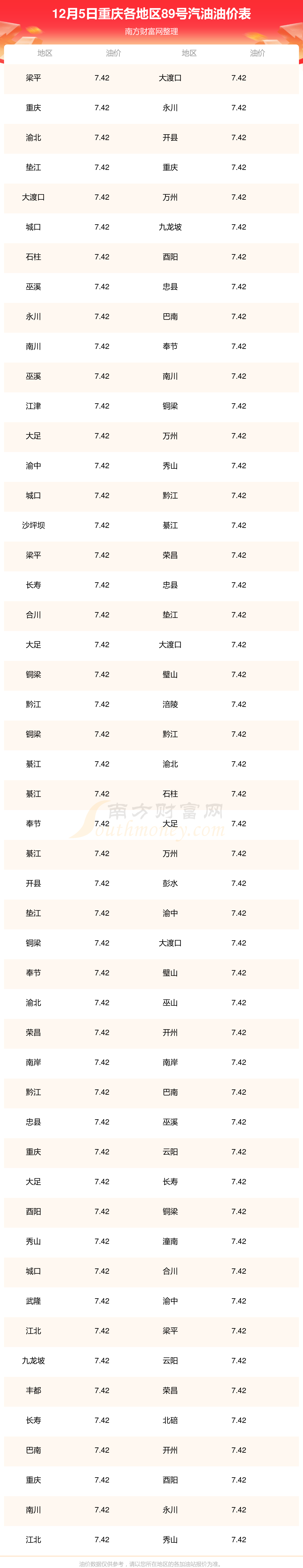 12月5日,重庆89号汽油的价格是6.58元每升,本次的调整时间为11月25日,对比上次的调整减了0.05元,减0.754%,12月8日24时为下一轮油价调整时间,还有3.82天。