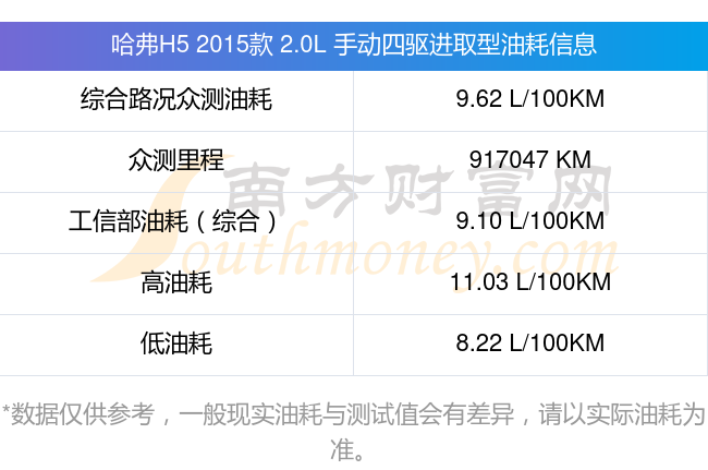 根据车主实测数据,该车型低油耗为8.22L/100km,高油耗为11.03L/100km,综合路况众测油耗为9.62L/100km,工信部综合油耗为9.10L/100km。