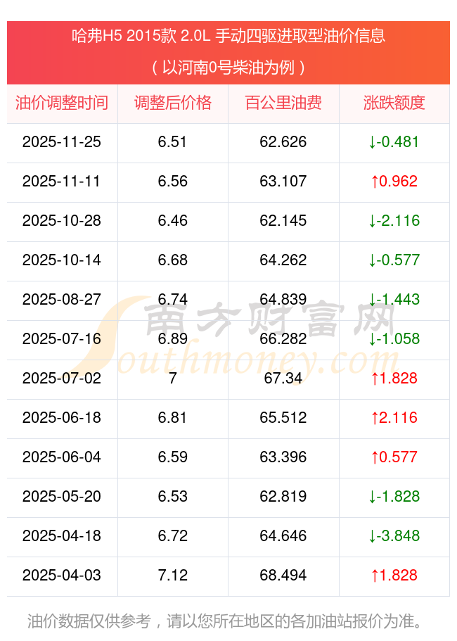 按照11月25日0号柴油最新调整价格6.51元/升来计算(以河南为例),该车型百公里平均油费为62.626元,按照上一轮11月11日调整价格6.56元/升来计算,百公里平均油费为63.107元,对比上一轮少花0.481元,下一轮油价调整时间为12月8日24时。