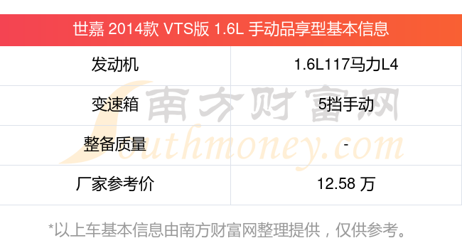 世嘉 2014款 VTS版 1.6L 手动品享型动力上搭载的是一台1.6L117马力L4自然吸气发动机,匹配5挡手动挡变速箱,燃料形式为汽油,厂家参考价12.58万元。