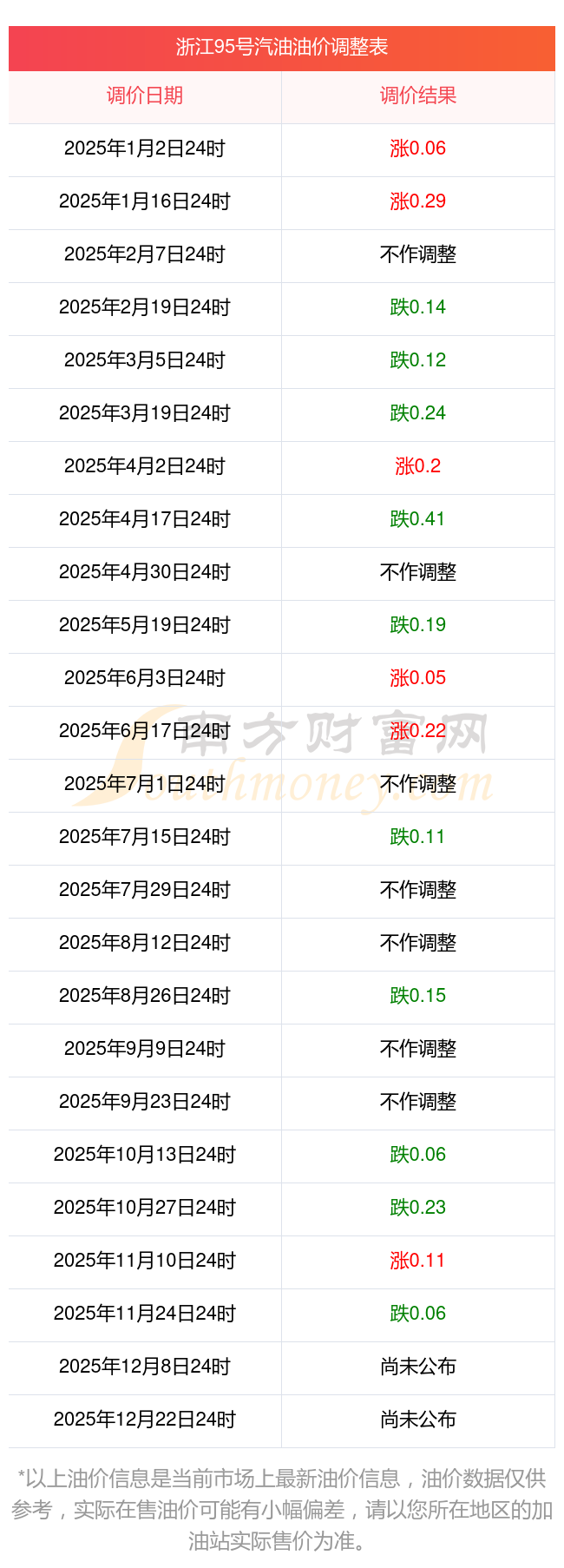 12月5日的瑞安汽油、柴油每升最新价格(调整时间为11月25日):92号汽油为6.86元,下降了0.06元,下降幅达0.87%;95号汽油为7.3元,下降了0.06元,下降幅达0.82%;89号汽油为6.36元,下降了0.05元,下降幅达0.78%;0号柴油为6.51元,下降了0.06元,下降幅达0.91%。