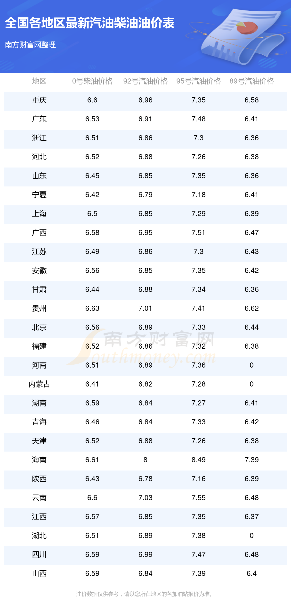 以上油价信息是当前市场上最新油价信息,油价数据仅供参考,实际在售油价可能有小幅偏差,请以您所在地区的加油站实际售价为准。