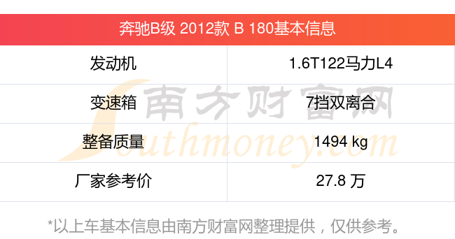 奔驰B级 2012款 B 180动力上搭载的是一台1.6T122马力L4涡轮增压发动机,匹配7挡双离合自动档变速箱,燃料形式为汽油,常规整备质量1494kg,厂家参考价27.8万元。