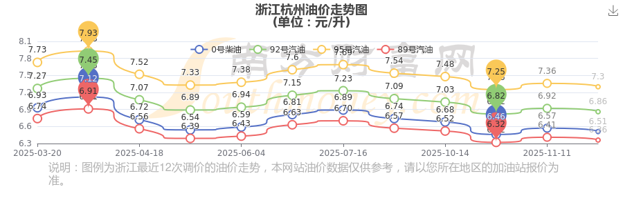 12月5日浙江杭州汽油柴最新油价是多少?具体每升为:11月25日调整后,92号汽油为6.86元,下跌了0.06元,下跌幅达0.87%;95号汽油为7.3元,下跌了0.06元,下跌幅达0.82%;89号汽油为6.36元,下跌了0.05元,下跌幅达0.78%;0号柴油为6.51元,下跌了0.06元,下跌幅达0.91%。