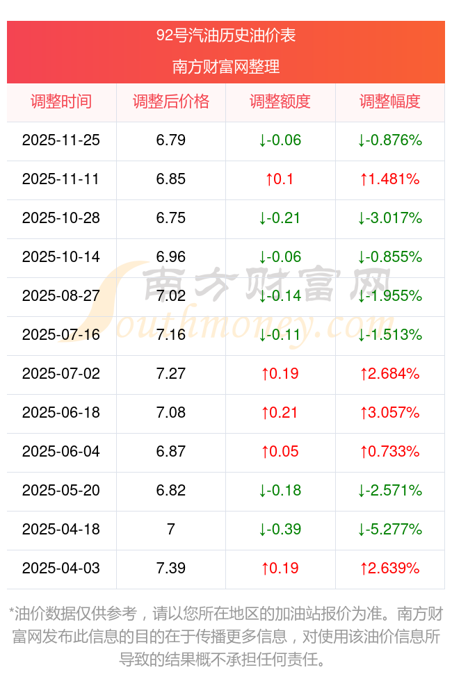 油价调整最新消息:下一轮油价调整时间12月8日24时。12月5日,宁夏汽油、柴油的价格为11月25日调整后的价格。具体为:92号汽油6.79元,跌了0.06元;95号汽油7.18元,跌了0.06元;89号汽油6.41元,跌了0.05;0号柴油6.42元,跌了0.05元。