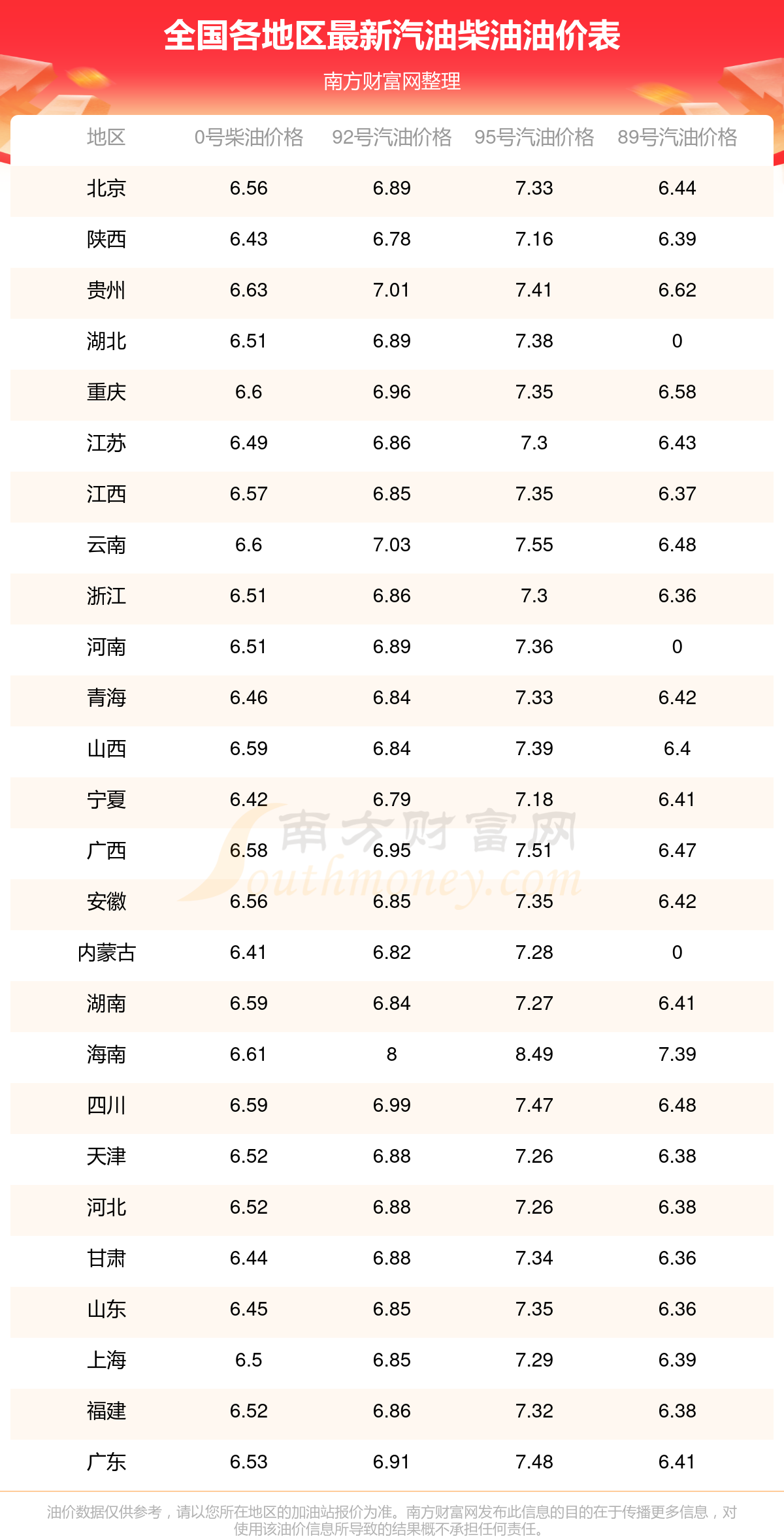 油价数据仅供参考,请以您所在地区的各加油站报价为准。