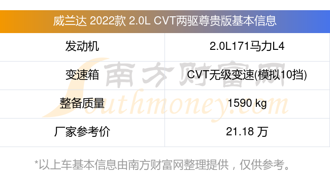 威兰达 2022款 2.0L CVT两驱尊贵版搭载了一台2.0L171马力L4自然吸气发动机,采用CVT无级变速(模拟10挡)自动档变速箱,常规整备质量1590kg,厂家参考价21.18万元。