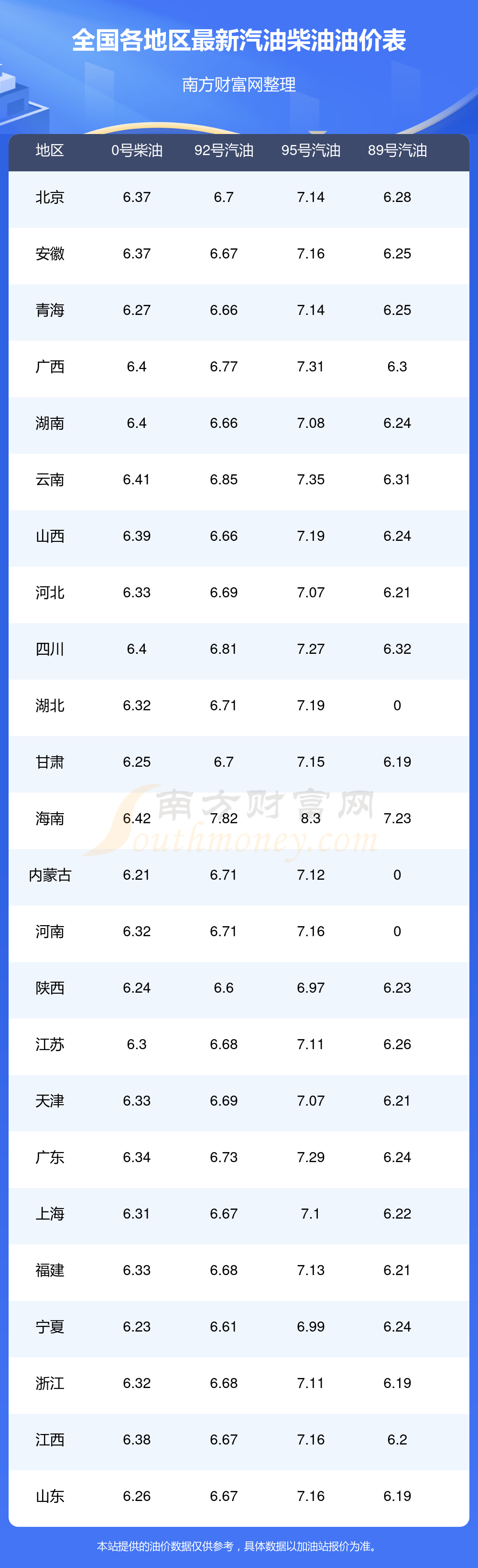 油价调整最新消息:油价最新调整时间为12月23日 ,全国92号汽油最新平均价格为:7元每升,其中,最高为海南,价格为7.82元/升,最低为陕西,价格为6.60元/升。全国95号汽油最新平均价格为:7元每升,其中,最高为海南,价格为8.30元/升,最低为陕西,价格为6.97元/升。全国0号柴油最新平均价格为:6元每升,其中,最高为海南,价格为6.42元/升,最低为内蒙古,价格为6.21元/升。全国89号汽油最新平均价格为:6元每升,其中,最高为海南,价格为7.23元/升,最低为浙江,价格为6.19元/升。下一轮汽油价格调整时间12月31日24时,距离现在还有0天。