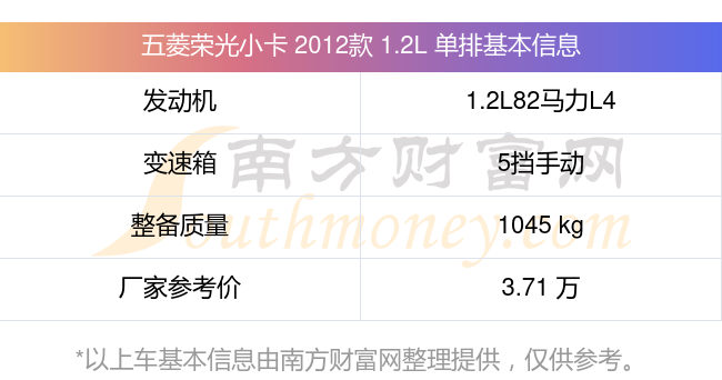 在动力方面,五菱荣光小卡 2012款 1.2L 单排搭载的是一台1.2L82马力L4自然吸气发动机,匹配5挡手动挡变速箱,燃料形式为汽油,常规整备质量1045kg,厂家参考价3.71万元。