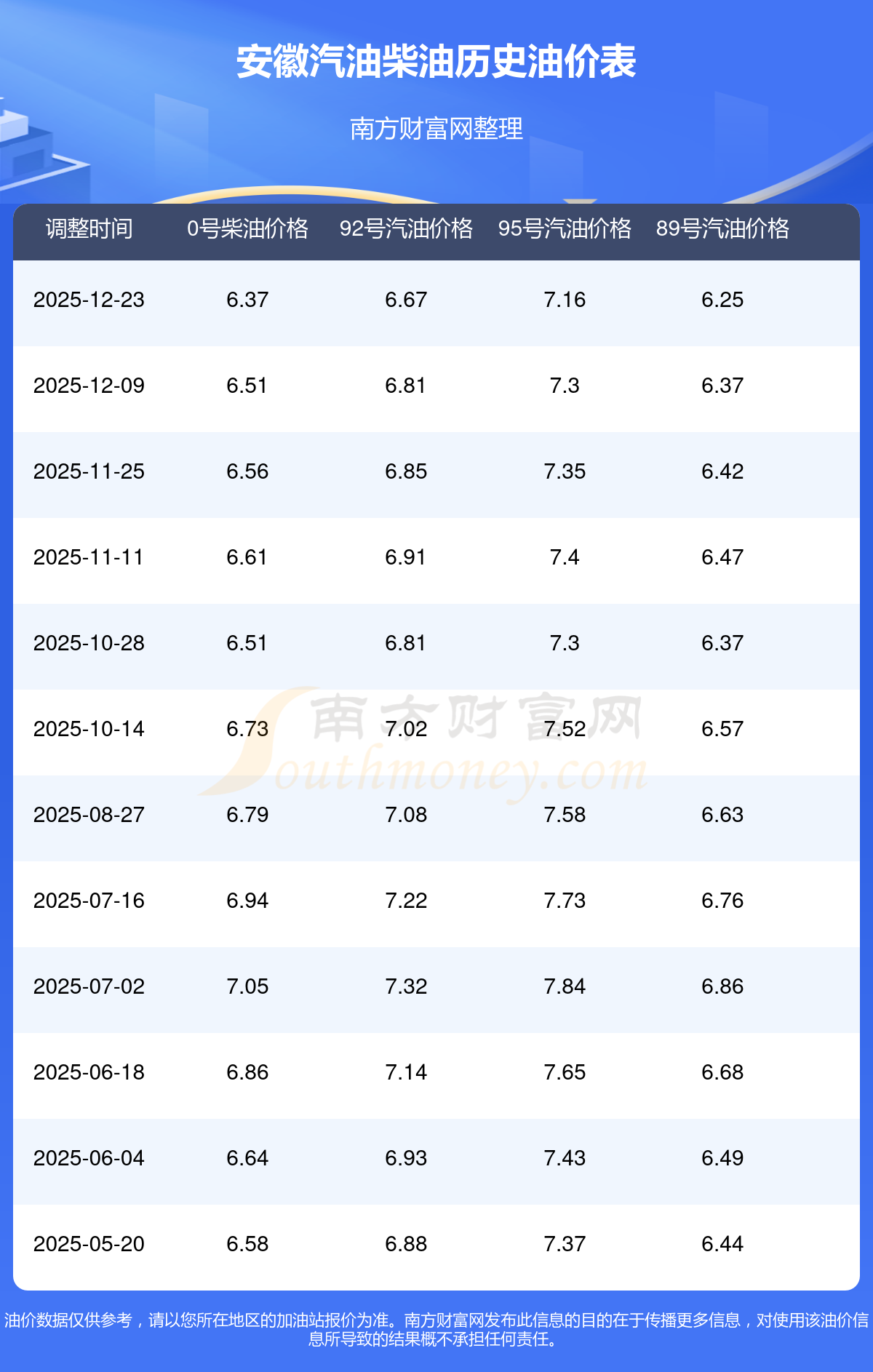 油价数据仅供参考,请以您所在地区的加油站报价为准。南方财富网发布此信息的目的在于传播更多信息,对使用该油价信息所导致的结果概不承担任何责任。