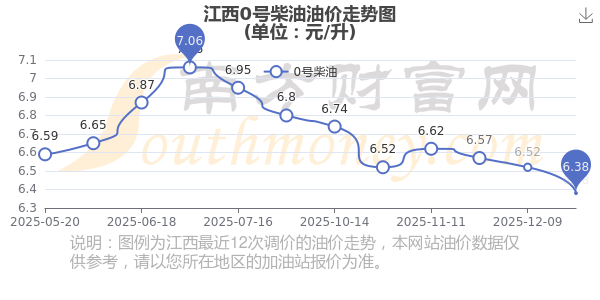 12月29日,江西0号柴油的价格是6.38元每升,本次的调整时间为12月23日,对比上次的调整下跌了0.14元,下跌2.147%,下次调整时间为12月31日24时,还有0天。