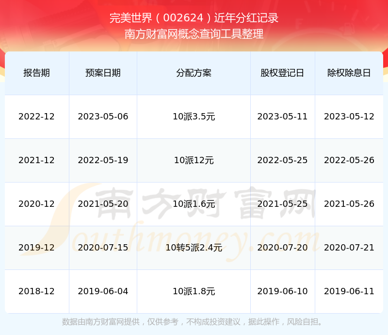完美世界最新一次公布的分红方案为10派3.5元。本次权益分派股权登记日为2023年5月11日,除权除息日为2023年5月12日,派息日为2023年5月12日。