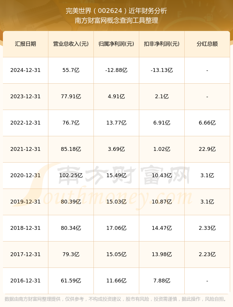 完美世界公司2024年实现营业收入55.7亿元,同比增长-28.5%;净利润-12.88亿元,同比增长-361.98%;毛利率57.87%。