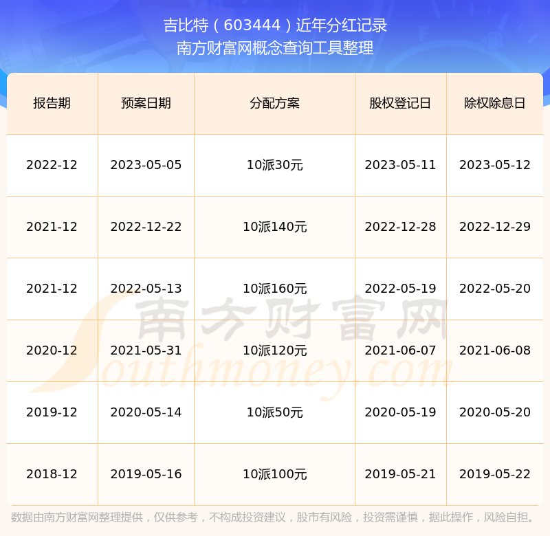 吉比特最新一次公布的分红方案为10派30元。本次权益分派股权登记日为2023年5月11日,除权除息日为2023年5月12日,派息日为2023年5月12日。