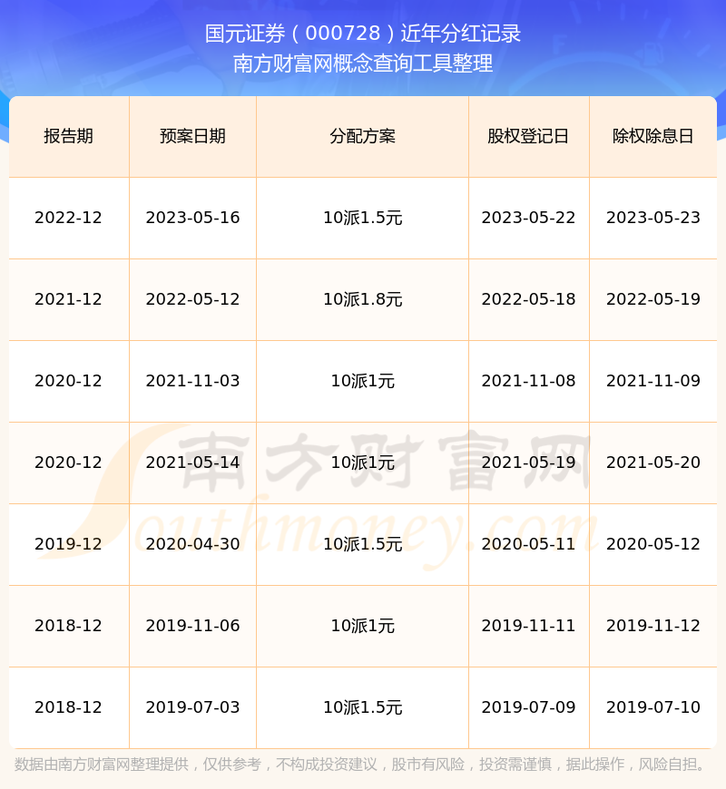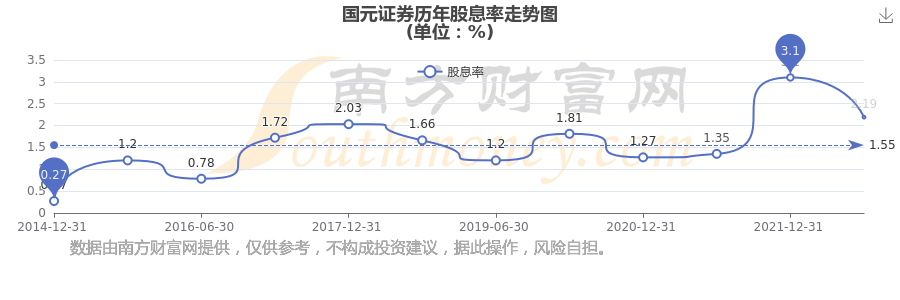 国元证券最新一次公布的分红方案为10派1.5元。本次权益分派股权登记日为2023年5月22日,除权除息日为2023年5月23日,派息日为2023年5月23日。