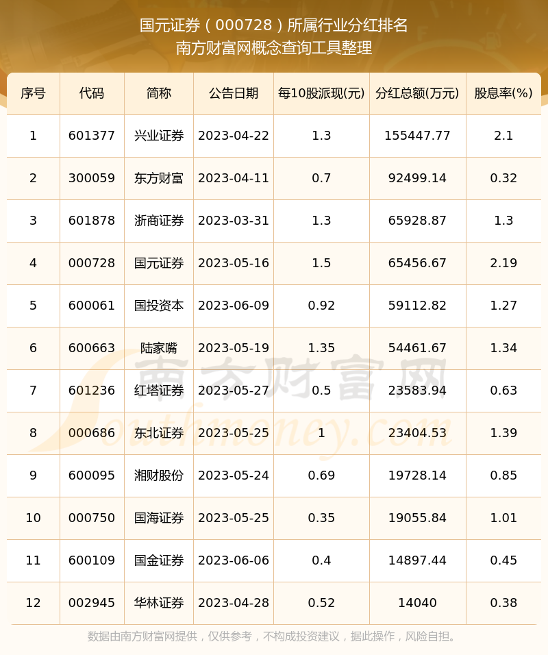 按照南方财富网趋势选股系统统计,国元证券所属行业为证券行业,证券行业分红排名情况如下表: