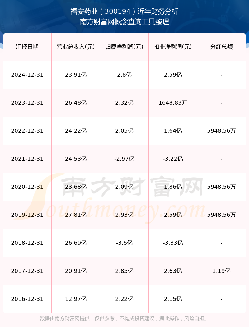 福安药业公司2024年实现营业收入23.91亿元,同比增长-9.68%;净利润2.8亿元,同比增长20.69%;毛利率52.96%。