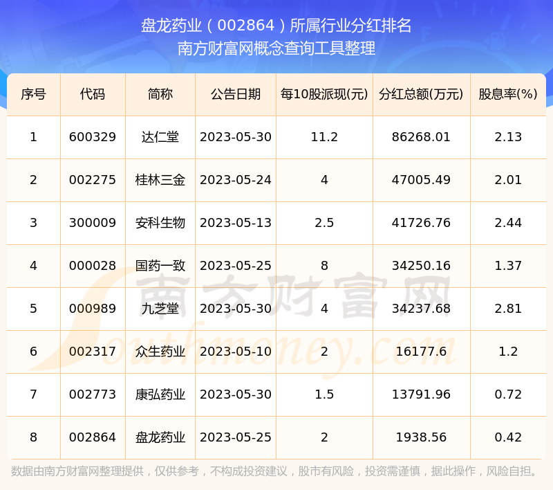 按照南方财富网趋势选股系统统计,盘龙药业所属行业为中成药行业,中成药行业分红排名情况如下表: